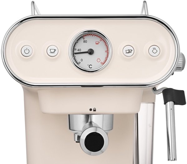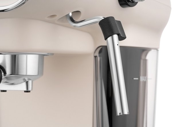 С помощью механического капучинатора с насадкой панарелло из нержавеющей стали каждый сможет приготовить чудесный капучино или латте. Все это возможно благодаря двойному фильтру и насосу итальянского производства с давлением в 15 бар. Контролировать температуру нагрева воды будет удобно с помощью специального индикатора в винтажном стиле.