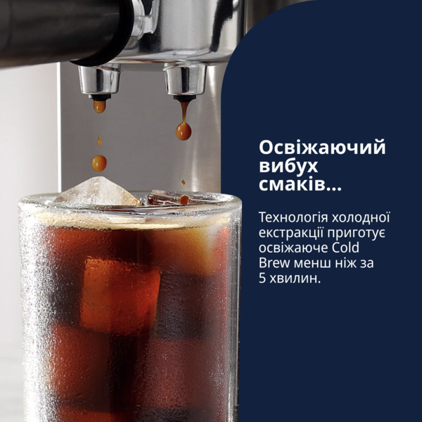 Приготовьте освежающий Cold Brew за несколько минут с помощью технологии холодной экстракции. Вода проходит через нагревательный элемент и при комнатной температуре поступает в систему заваривания. Процесс заваривания характеризуется пульсирующей работой насоса и низким давлением, благодаря чему кофе течет в чашку капля за каплей, как и при приготовлении капельным методом.