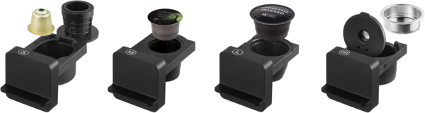 Кофеварка предназначена для всех наиболее популярных видов кофейных капсул. 3 адаптера для капсул (S - Nespresso, M - Caffissimo/Tchibo, L - Dolce Gusto) и 1 адаптер для молотого кофе.