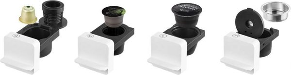 Кофеварка предназначена для всех наиболее популярных видов кофейных капсул. 3 адаптера для капсул (S - Nespresso, M - Caffissimo/Tchibo, L - Dolce Gusto) и 1 адаптер для молотого кофе.