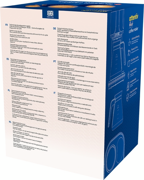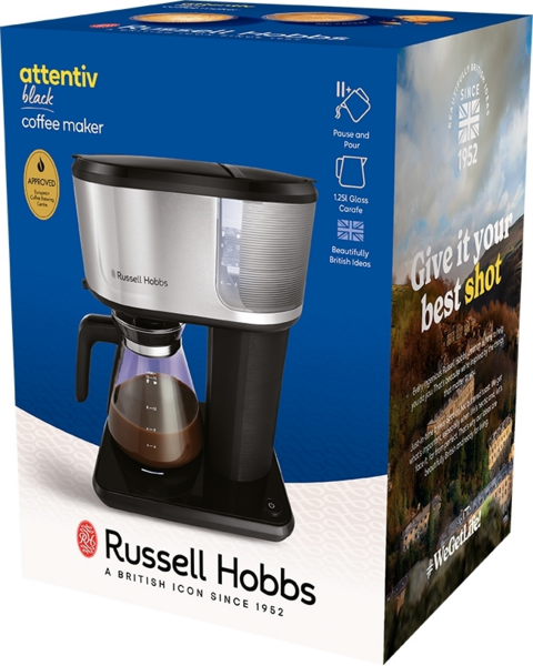 Кофеварка Attentiv от Russell Hobbs с сертификатом ECBC и передовой капельной технологией позволяет наслаждаться кофе дома, как в кафе. Независимо от того, нравится ли вам насыщенный или более мягкий вкус кофе, вы сможете насладиться любимым напитком за считанные минуты. Не можете дождаться первого глотка кофе? Функция приостановки капельной подачи позволяет снять кофейник в середине процесса капельной подачи, чтобы вы могли насладиться первой чашкой чуть раньше, а функция автоматического поддержания тепла сохраняет остаток сваренного кофе теплым в течение 40 минут. Вы готовите кофе для нескольких человек? Стеклянный кофейник объемом 1,25 л позволяет приготовить до 10 чашек одновременно. Стильная и удобная в использовании кофемашина Attentiv позволит вам наслаждаться вкусным кофе прямо у себя дома - именно так, как вы любите.