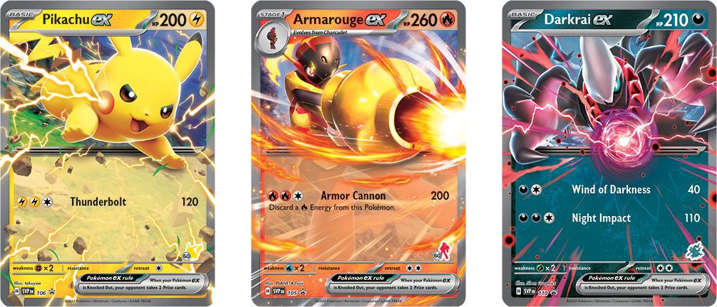 - 3 полные колоды Pokémon TCG по 60 карт в каждой (Armarouge ex, Pikachu ex или Darkrai ex).
