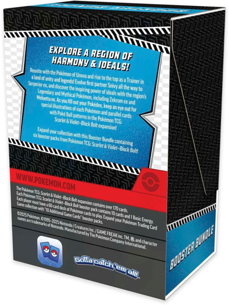 Встретьтесь снова с Pokémon из региона Unova и станьте лучшим тренером на земле единства и легенд! Развивайте своего первого партнера Snivy вплоть до Serperior ex и откройте для себя удивительную силу идей вместе с легендарными и мифическими Pokémon этого региона, в частности Zekrom ex и Meloetta ex. Заполняя свой Pokédex, обратите внимание на специальные иллюстрации каждого Pokémon и карты с узорами Poké Ball в дополнении Pokémon TCG: Scarlet & Violet - Black Bolt!