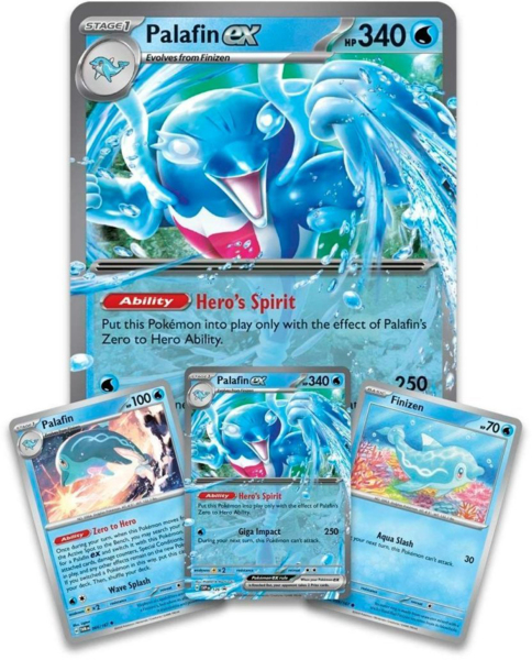 Когда кажется, что все потеряно в битве, призовите героя, чтобы спасти ситуацию! Благодаря способности "Zero to Hero", Palafin может потрясающе превратиться в могущественного Palafin ex, готового сокрушить противников силой океанской волны. В этой коробке вы найдете Finizen, Palafin и Palafin ex в виде игровых карт, а также большую версию Palafin ex и несколько бустер-паков с дополнительными картами внутри.