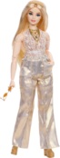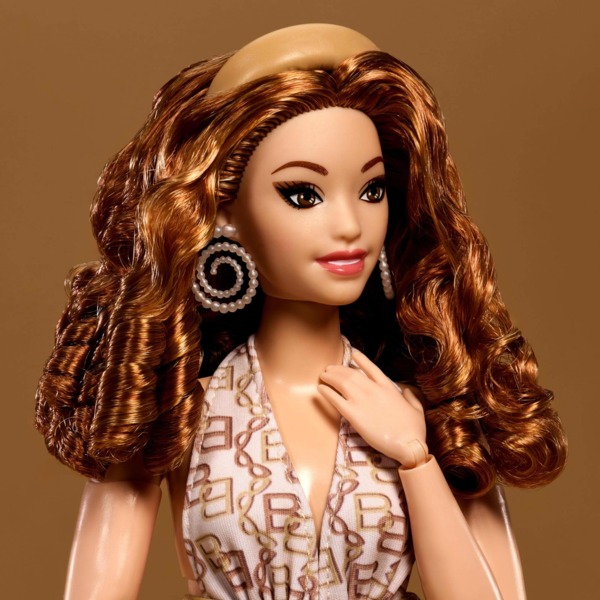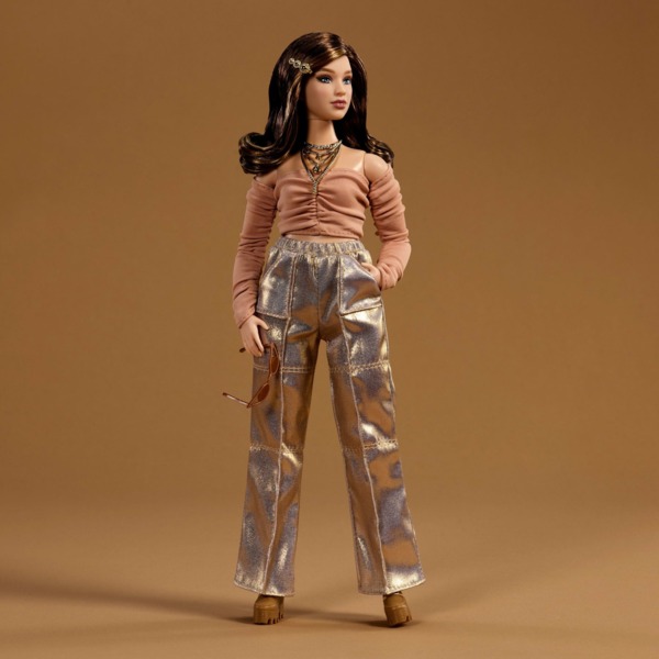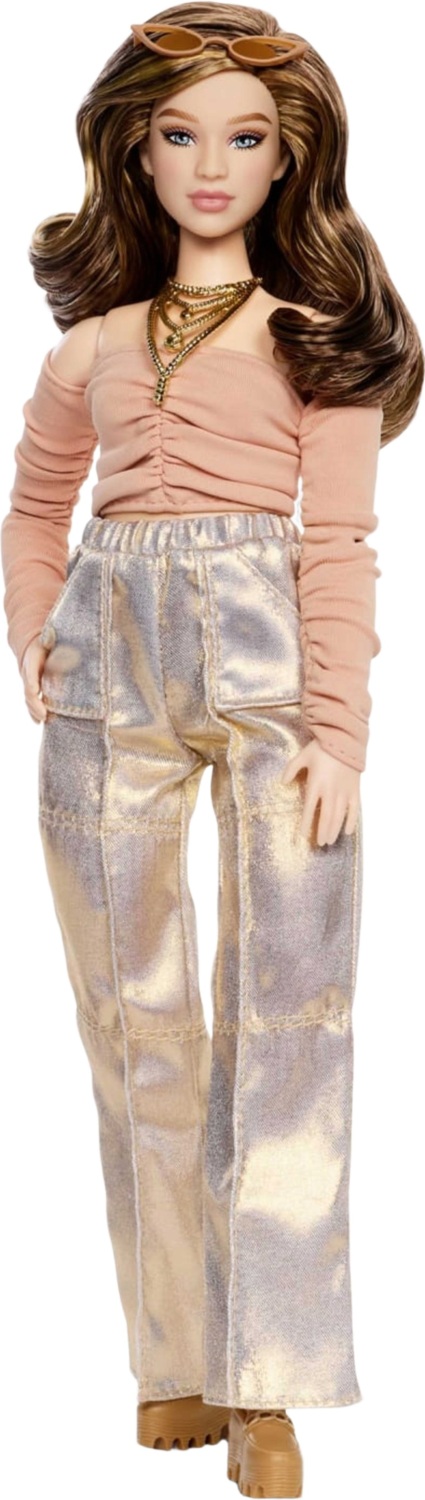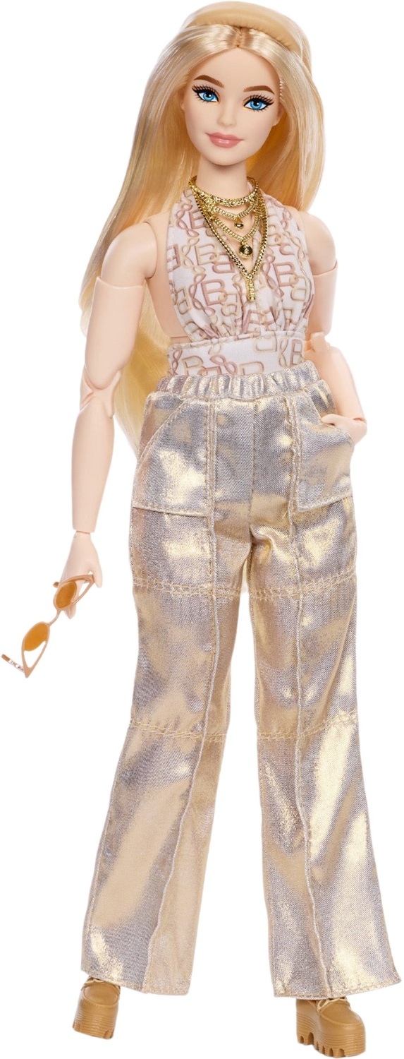 На кукле элегантные золотистые брюки и топ с открытыми плечами. В комплект также входят бежевая юбка с рюшами и купальник с золотым принтом буквы "B" для создания дополнительных образов.