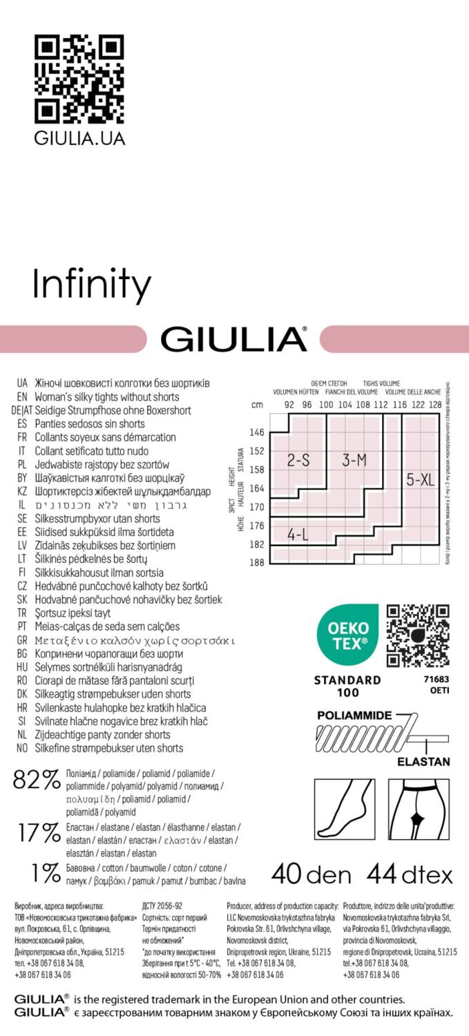 Элегантные колготки Giulia Infinity 40 обеспечивают максимальный комфорт и стиль. Они имеют шелковистую, матовую поверхность и плотность 40 den, что выглядит изящно и незаметно под одеждой. Колготки без шортиков, с мягким поясом T-band, хлопковой гигиенической ластовицей и плоскими швами созданы для комфортного ежедневного ношения. Натуральные благородные оттенки делают их идеальными для любого типа фигуры и подходят для любого стиля одежды, подчеркивая естественную красоту ваших ног.