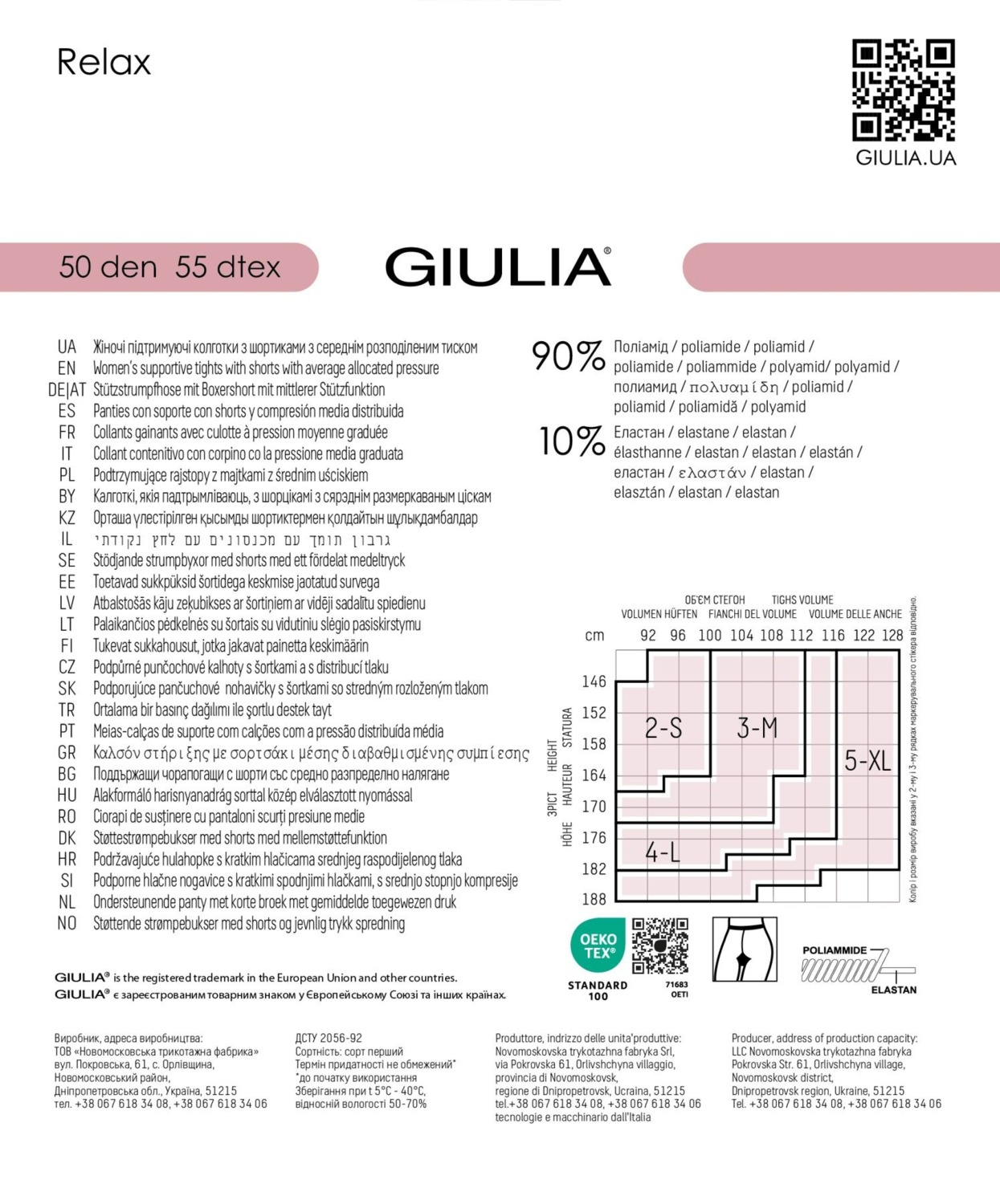 Благодаря специальному составу, плотности 50 den и технологии плетения колготки Giulia Relax 50 создают среднее распределенное давление по ноге, обеспечивая массажный эффект, который способствует стимуляции кровообращения и предотвращает отеки. Эти колготки имеют удобную среднюю посадку, полиамидную ластовицу и плотные поддерживающие шортики, которые эффективно моделируют силуэт и сделают вашу фигуру более стройной. Они идеально подходят для любого повседневного или вечернего образа, помогают уменьшить усталость ног и обеспечивают максимальный комфорт в течение всего дня.