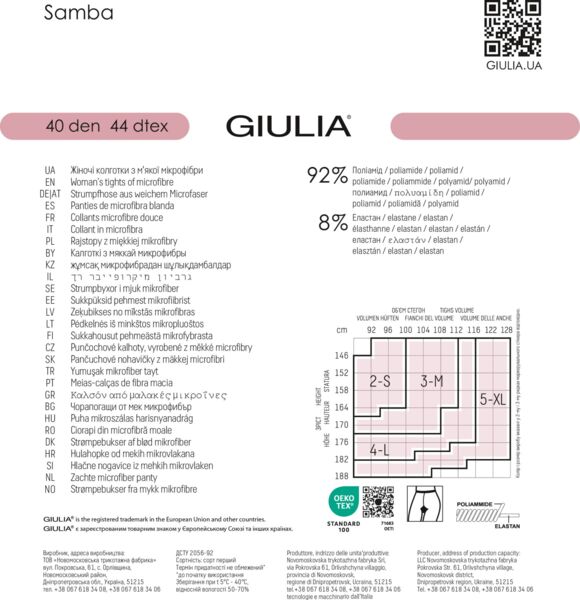 Модель колготок Giulia Samba 40 уникальна, так как имеет широкую цветовую палитру для любого образа и настроения. Эти однотонные матовые колготки плотностью 40 den не только добавляют ярких красок в ваш гардероб, но и прекрасно дополняют как праздничные, так и повседневные образы.