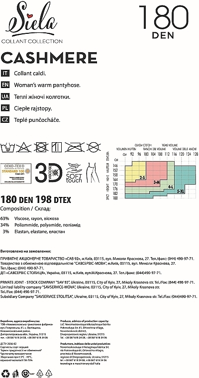 Теплые и прочные классические без шортиков Cashmere колготки от украинского бренду Siela, ассоциируются с качеством, комфортом и теплом, хотя фактически сделаны из сочетания вискозы, полиамида и эластана, а не чистого кашемира. Это базовые тёплые колготки, которые подойдут под платья и юбки в холодный сезон и обеспечат плотное покрытие ног.