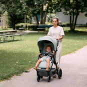 Благодаря функции фиксации в сложенном состоянии коляска может самостоятельно стоять в вертикальном положении, что делает ее идеальным спутником - как в городе, так и во время путешествий.