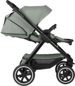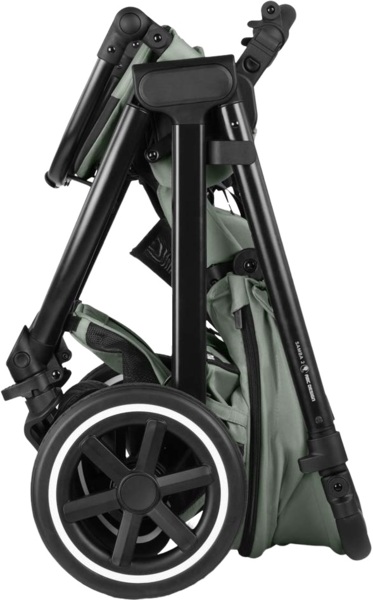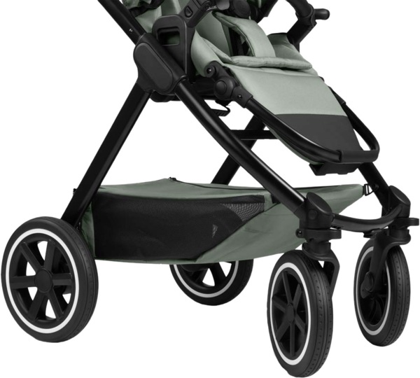 Тормоз расположен непосредственно на правом заднем колесе. Это устраняет необходимость в задней оси. Это не только экономит пространство, но и повышает комфорт благодаря пространству для ног, особенно для высоких родителей.