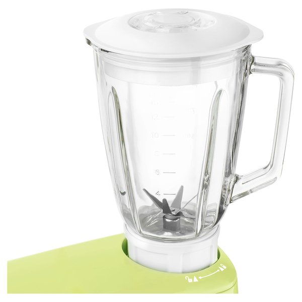 Штыковая система крепления насадок позволяет быстро надевать и менять их. Фиксирующий предохранитель в верхней позиции откидной части корпуса. Стеклянная чаша миксера на 1,5 л. Мясорубка для грубого и мелкого помола
