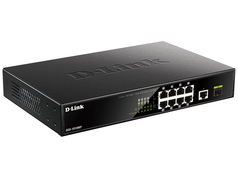 Коммутатор D-Link DGS-1010MP, оснащенный 9 портами 10/100/1000Base-T (8 портов поддерживают Power over Ethernet (PoE)) и портом 1000Base-X SFP, предназначен для малого бизнеса и позволяет подключать и подавать питание по Ethernet-кабелям на такие устройства, как PoE-совместимые беспроводные точки доступа, сетевые камеры или IP-телефоны. Данный коммутатор оснащен пассивной системой охлаждения, которая обеспечивает бесшумную работу устройства, что позволяет поместить его практически в любой комнате или офисе.