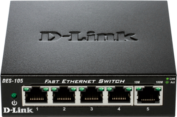 5-Port Fast Ethernet Unmanaged Desktop Switch DES-105 - это 5-портовый 10/100 Мбит/с коммутатор Fast Ethernet, который позволяет быстро настроить проводную сеть. Подключите DES-105 к нескольким компьютерам для совместного использования файлов и папок или подключите его к маршрутизатору для совместного использования интернет-соединения.