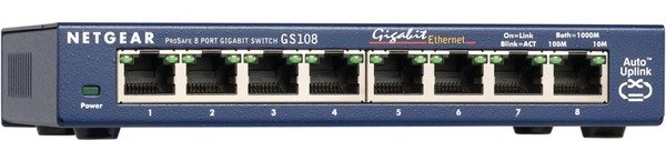 Неуправляемый гигабитный коммутатор NETGEAR PROSAFE GS108GE имеет 8 портов 10/100 Мбит/с, на каждом из которых есть световая индикация активности. Пропускная способность коммутатора составляет 16 Гбит/с. Технология Green Ethernet уменьшает энергопотребление маршрутизатора. Характерными особенностями этого коммутатора являются: приоритеты трафика, группы виртуальных сетей и мониторинг сети.