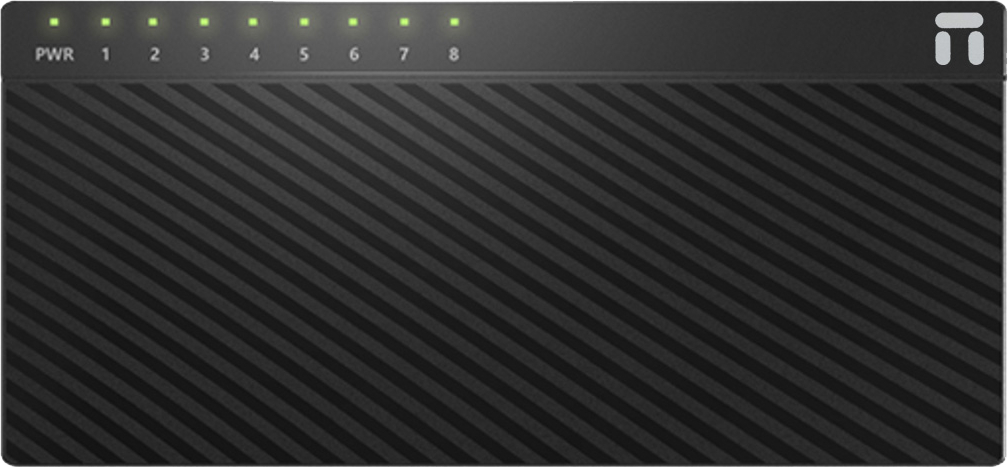 Коммутатор оснащен восемью портами RJ-45 со скоростью 10/100/1000 Мбит/с. Функции автосогласования и авто MDI/MDIX позволяют автоматически определять тип соединения, устраняя необходимость в использовании перекрестных кабелей.