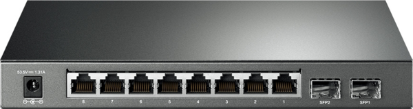 - Гигабитные порты: 8 гигабитных портов PoE+ и 2 гигабитных SFP-слота для быстрых подключений.