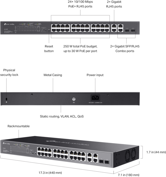 Интеллектуальный коммутатор TP-Link TL-SL2428P оснащен 24 портами RJ45 10/100 Мбит/с, 2 портами RJ45 10/100/1000 Мбит/с и 2 комбинированными гигабитными слотами SFP/RJ45. Все 24 порта RJ45 10/100 Мбит/с поддерживают стандарт 802.3at/af (PoE+) с общим бюджетом мощности PoE 250 Вт и полезными функциями управления. Коммутатор обеспечивает высокую производительность, QoS корпоративного уровня, полезные стратегии безопасности и возможности управления на уровне 2.