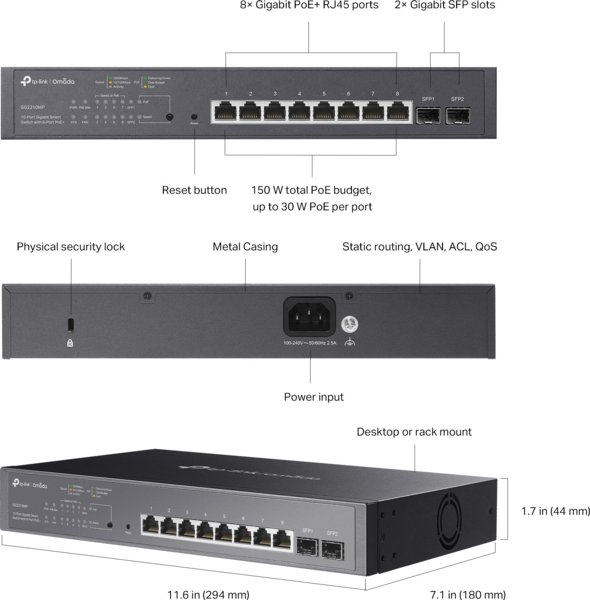 Характеристики Коммутатор TP-LINK TL-SG2210MP 8xGE (8xPoE) 2xSFP, 150Вт, WebSmart (SG2210MP)