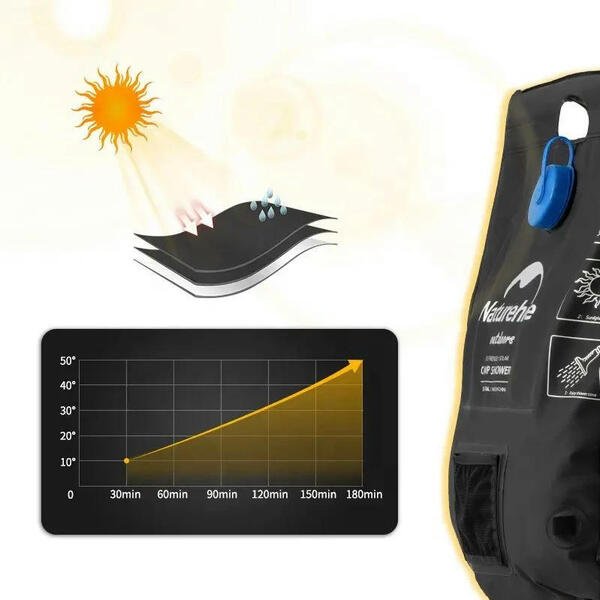 Кемпинговый душ от Naturehike предназначен для использования в полевых условиях. Его объем составляет 20 литров. Резервуар выпускается в черном цвете, поэтому под прямыми лучами солнца вода внутри нагревается до 40-50°C в течение 3 часов. Резервуар изготовлен из ЭВА — полимерного материала, который отличается износостойкостью, гибкостью и высокой теплоизоляцией. Полимер невосприимчив к воздействию химических веществ и перепадов температур.