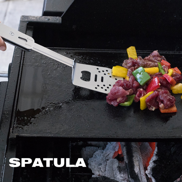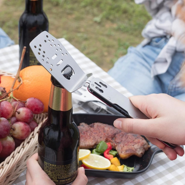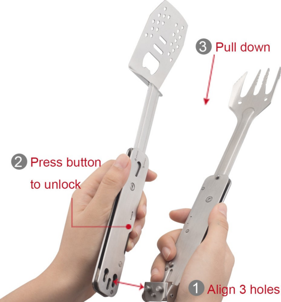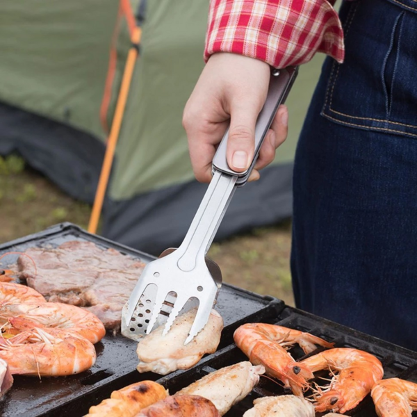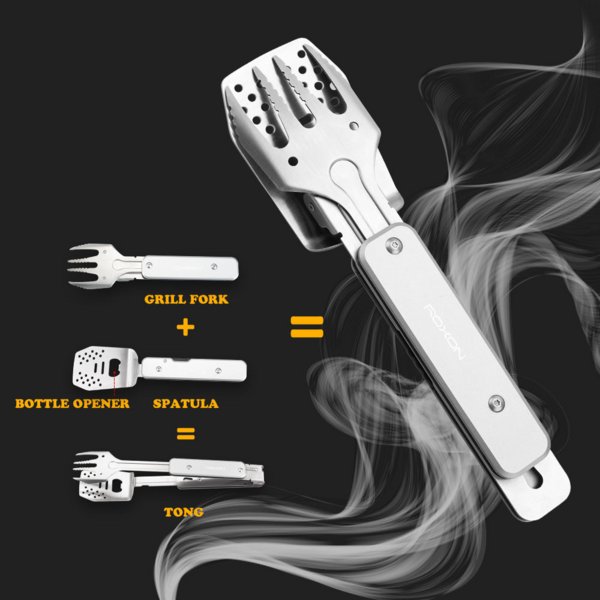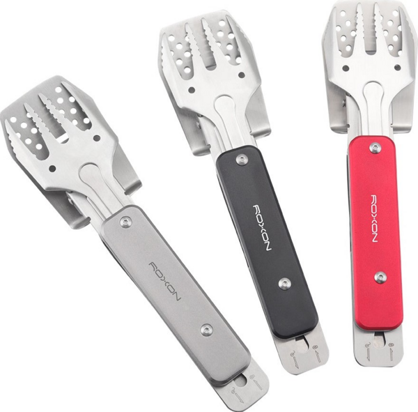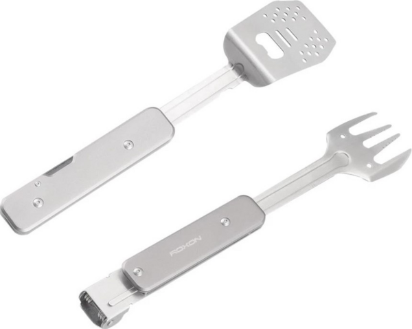 Модель S602 от бренда Roxon - это компактная версия мультитула для приготовления барбекю. Он состоит из металлических лопатки и вилки, которые могут использоваться как самостоятельные инструменты, а вместе образуют удобные щипцы. Кроме того, в лопатку встроена открывалка для бутылок. Эта модель хорошо подходит для любых поездок на пикник или в кемпинг, она будет полезной на даче. Преимущество S602 заключается в том, что это достаточно компактный инструмент. Но поворотная конструкция каждого из элементов превращает их в полноценный инструмент, которым удобно пользоваться. Выделка имеет 4 зубчика с небольшими зазубринами для большей надежности. Лопатка немного изогнута для того, чтобы работать ею было удобнее. Кроме того, на ее поверхности сделан целый ряд отверстий, чтобы сквозь них мог стекать лишний жир. Самое большое отверстие - это встроенная открывалка для бутылок. В сложенном состоянии два инструмента можно соединить между собой, чтобы они не потерялись, и положить для хранения в нейлоновый чехол на липучке. Можно соединить и готовые к использованию лопатку и вилку. В этом случае получаются щипцы, которыми удобно переворачивать мясо или овощи на гриле. Основным материалом для набора для пикника является сталь 430. Это хорошо защищенная от коррозии нержавейка, за которой просто ухаживать. Сделанные из нее инструменты достаточного вымыть после использования и вытереть насухо. Также для этого мультитула используется сталь 2Cr13 и алюминиевый сплав.
