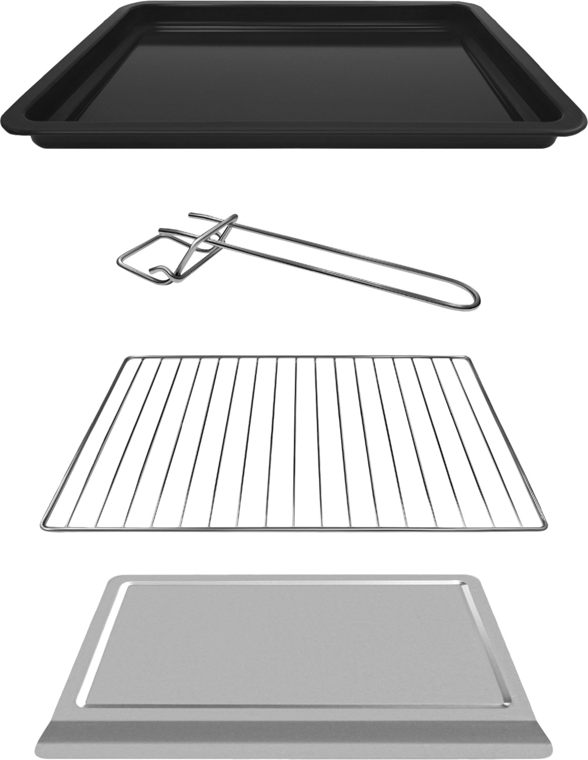 | Комплектация | Документация, Печь, Поддон для крошек, Противень, Распылитель, Резервуар, Решетка для гриля, Ручка для безопасного извлечения противня/решетки, Форма для выпечки |