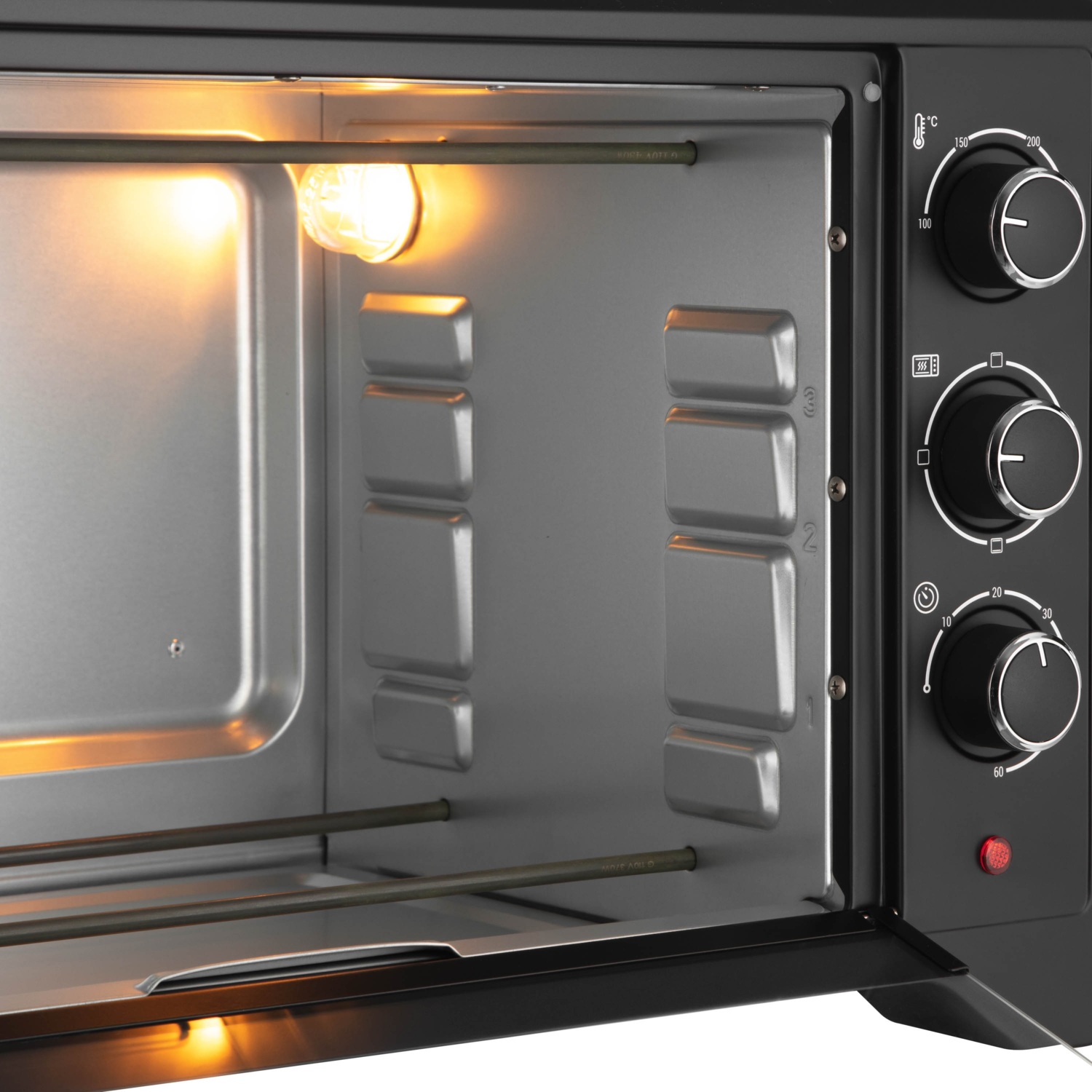 Благодаря мощности 1615 Вт электропечь быстро нагревается и поддерживает стабильную температуру в диапазоне от 100 до 250°C. Это позволяет использовать ее для самых разнообразных кулинарных задач: нежного тушения, выпечки хлеба или десертов, запекания овощей или приготовления сочного мяса на гриле. Объем составляет 33 л - достаточно места, чтобы готовить блюда для всей семьи или экспериментировать с большими порциями. Предусмотрено три режима работы, которые помогают настраивать оптимальные параметры в зависимости от рецепта. Таймер до 60 мин позволяет устанавливать точное время приготовления, а индикация завершения процесса информирует о готовности.