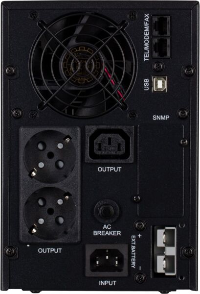 При весе 11,6 кг устройство имеет размер 215х144х345 мм. Тип установки: Tower. Уровень шума - 50 дБ. Изделие имеет функции «холодный старт» и «рестарт», защиту от короткого замыкания, перегрузки, перегрева, полной разрядки и перезарядки аккумулятора. Также есть самотестирование, автоматический заряд АКБ, если ИБП подключен к сети, ECO режим экономии электроэнергии.