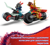 Набор содержит воина-ниндзю Кая и лихого Призрачного Разведчика-дракона, которые едут на игрушечных мотоциклах. Оба персонажа вооружены крутыми мечами.