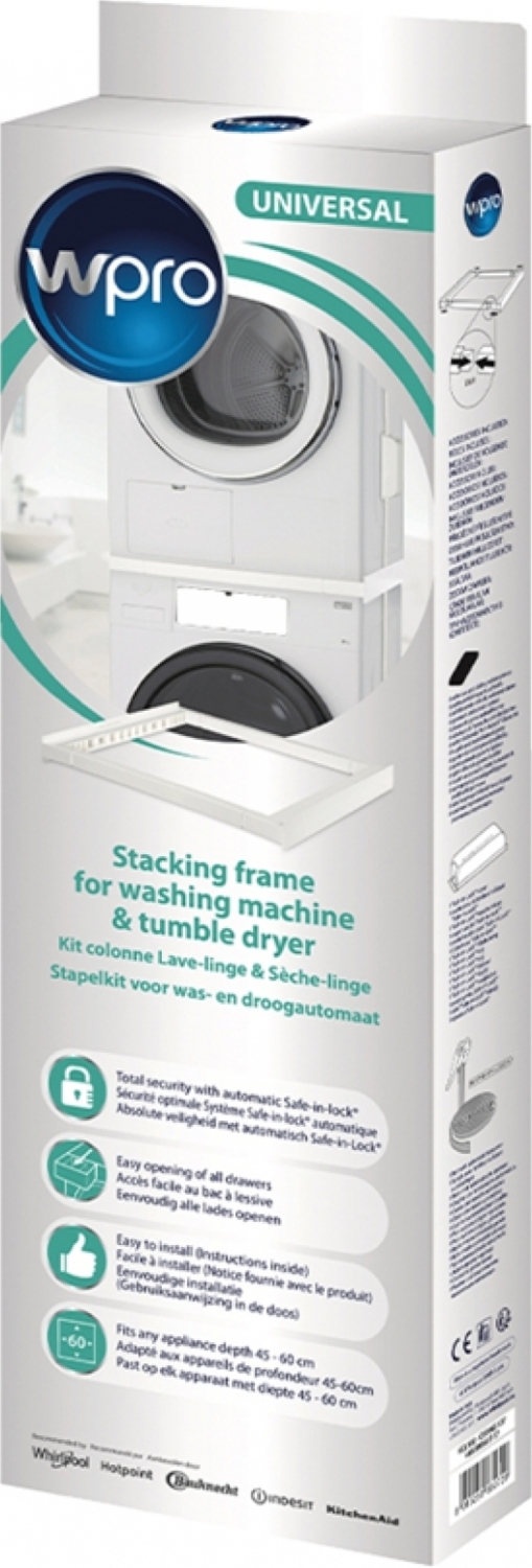 Комплект подходит для соединения любых стиральных и сушильных машин и их установки в колонну. Рабочая глубина составляет от 45 см до 60 см.