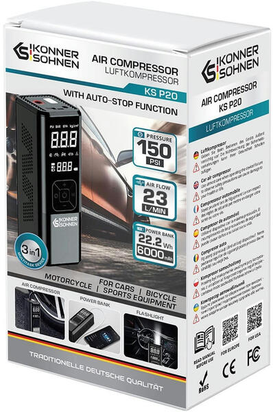 Автомобильный компрессор KS P20 с функцией повербанка от Könner & Söhnen - это надежный помощник для накачки любых типов колес (авто-мото техники, велосипедов, колясок, садовых и строительных тачек и др), а также пригодится и владельцам спортинвентаря, подходит для мячей, надувных матрасов, плавательных игрушек, жилетов и других надувных изделий. Накачка происходит за счет аккумуляторной батареи, то есть нет необходимости подключать компрессор к источнику питания (электросети или аккумулятора авто), процесс накачки занимает считанные минуты. Скорость накачки компрессором KS P20 составляет 23 литра в минуту. Поддержание рекомендованного давления в шинах - гарантия долговечности шин, лучшее сцепление в условиях бездорожья и экономия топлива. Регулярно проверяя давление в шинах, вы можете избежать преждевременного износа шин. Это означает экономию средств, поскольку вам не нужно будет так часто менять шины. Наличие собственного воздушного компрессора обеспечивает удобство, поскольку вы сможете подкачивать в любое время, избегая поиска станции с исправным компрессором и оплаты услуг. В комплект поставки входит набор из трех насадок-переходников и иглы для накачки мячей, кабель под разъем Type-C для зарядки, кабель прикуривателя, воздушный шланг и удобная сумка для хранения.