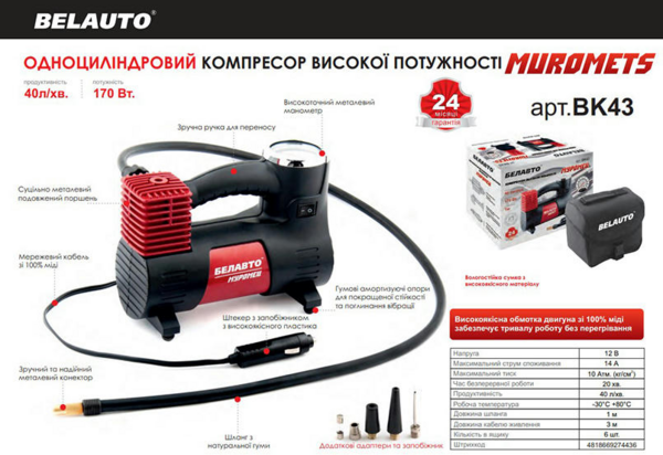 Компрессор Belauto автомобильный Muromets 10Атм 40 л/мин 170Вт (BK43)