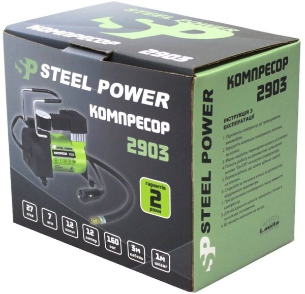 - Компрессор Steel Power 12В, 12А, 7Атм, 27 л/мин, от прикуривателя (SPR_2903)