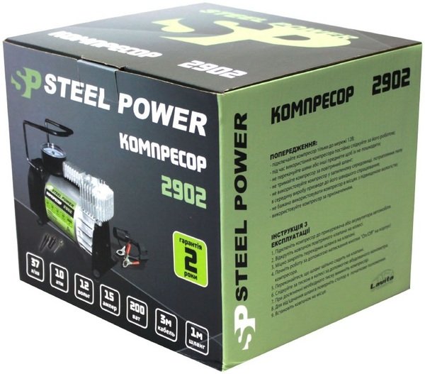 Компрессор Steel Power 2902 предназначен для избежания случайных повреждений, в частности пробития или спущенного колеса. Незаменимое устройство в транспортном средстве для тех, кому важно безопасное и комфортное использование автомобиля. Без проблем поднимает давление в шинах до необходимого уровня за счет большого максимального давления, которое составляет 10 атм. Достаточно быстро накачает необходимое спущенное колесо с помощью своей производительности в 37 л/мин. Компрессор является однопоршневым с цифровым манометром, что позволит ориентироваться на показатели и с легкостью поднимать давление до нужного уровня. Благодаря длине кабеля питания и длине воздушного шланга, есть возможность использовать прибор на приличном расстоянии от необходимого колеса. Корпус изготовлен из прочного материала, который увеличивает надежность устройства, а также увеличивает максимальное время эксплуатации. Устройство используется тогда, когда по разным причинам в автомобильных шинах давление становится меньше нормального уровня. Достаточно качественная и дорогая резина может подвергаться проколу шины, либо сжатый воздух имеет возможность начать проникать через покрышки. Для избежания таких ситуаций используется компрессор.