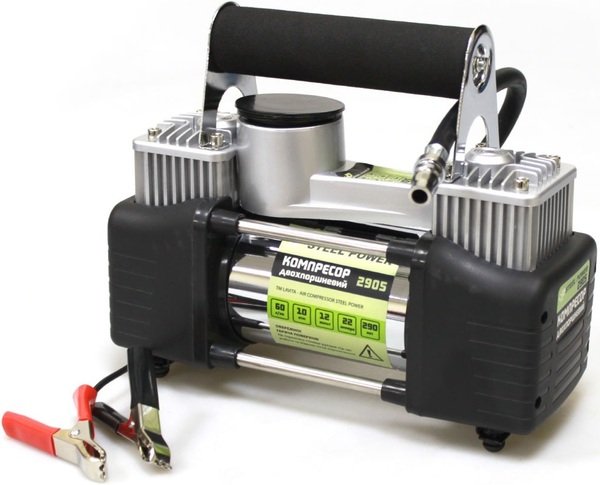 Компрессор Steel Power 2905 предназначен для избежания случайных повреждений, в частности пробития или спущенного колеса. Незаменимое устройство в транспортном средстве для тех, кому важно безопасное и комфортное использование автомобиля. Без проблем поднимает давление в шинах до необходимого уровня за счет большого максимального давления, которое составляет 10 атм. Достаточно быстро накачает необходимое спущенное колесо с помощью своей производительности в 60 л/мин. Компрессор является двухпоршневым с цифровым манометром, что позволит ориентироваться на показатели и с легкостью поднимать давление до нужного уровня. Благодаря длине кабеля питания и длине воздушного шланга, есть возможность использовать прибор на приличном расстоянии от необходимого колеса. Корпус изготовлен из прочного материала, который увеличивает надежность устройства, а также увеличивает максимальное время эксплуатации. Устройство используется тогда, когда по разным причинам в автомобильных шинах давление становится меньше нормального уровня. Достаточно качественная и дорогая резина может подвергаться проколу шины, либо сжатый воздух имеет возможность начать проникать через покрышки. Для избежания таких ситуаций используется компрессор.