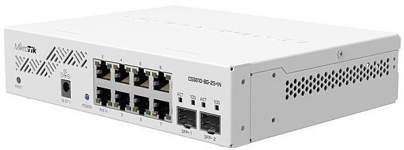 MikroTik CSS610-8G-2S+IN — это управляемый коммутатор 3-го уровня (Layer 3) на 8 гигабитных Ethernet портов и 2 оптических SFP+ порта. Оптические порты поддерживают модули SFP 1.25G и SFP+ 10G.