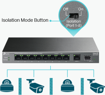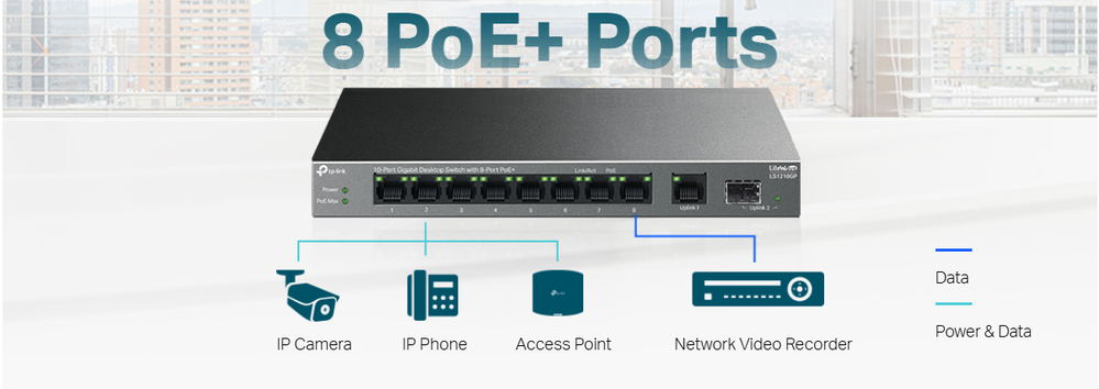 10-портовый гигабитный настольный коммутатор с 8 портами PoE+. Идеально подходит для IP-видеонаблюдения на расстоянии до 250 м.
