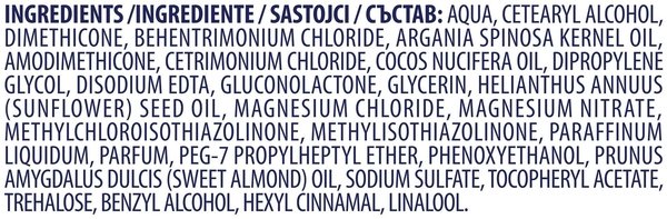 | Состав | Aqua, Cetearyl Alcohol, Dimethicone, Behentrimonium Chloride, Parfum, Dipropylene Glycol, Glycerin, Amodimethicone, Gluconolactone, Trehalose, Disodium EDTA, PEG-7 Propylheptyl Ether, Cetrimonium Chloride, Phenoxyethanol, Magnesium Nitrate, Sodium Sulfate, Prunus Amygdalus Dulcis Oil, Cocos Nucifera Oil, Paraffinum Liquidum, Tocopheryl Acetate, Argania Spinosa Kernel Oil, Helianthus Annuus Seed Oil, Methylchloroisothiazolinone, Methylisothiazolinone, Benzyl Alcohol, Hexyl Cinnamal, Linalool |