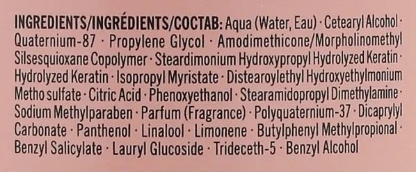| Состав | Aqua (Water, Eau) Cetearyl Alcohol, Quaternium-87, Propylene Glycol, Amodimethicone/Morpholinomethyl Silsequioxane Copolymer, Steardimonium Hydroxypropyl Hydrolyzed Keratin, Hydrolyzed Keratin, Isopropyl Myristate, Distearoylethyl Hydroxyethylmonium Methosulfate, Citric Acid, Phenoxyethanol, Stearamidopropyl Dimethylamine, Sodium Methylparaben, Parfum (Fragrance), Polyquaternium-37, Dicaprylyl Carbonate, Panthenol, Linalool, Limonene, Butylphenyl Methylpropional, Benzyl Salicylate, Lauryl Gluco |