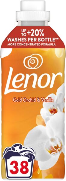 Кондиционер для белья Lenor Золотая орхидея и ваниль с эфирными маслами. Его аромат сохраняется на вещах до трех раз дольше. Кондиционер демонстрирует высокую эффективность даже в условиях быстрой стирки в холодной воде.