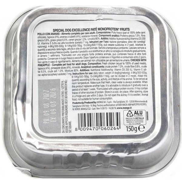 Характеристики Консерва для собак Monge Spesial Dog Exellence Fruit курица з ананасом 150 г