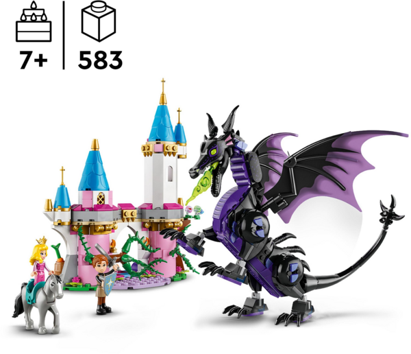 Эпические истории ждут детей и поклонников "Спящей красавицы" Диснея в возрасте от 7 лет, когда они будут собирать этот конструктор LEGO Disney Малефисента в форме дракона. В набор входят мини-куклы Авроры и принца Филиппа, фигурка лошади Самсона и фигурка дракона с подвижными головой, ногами и хвостом, а также складывающимися крыльями.