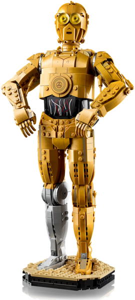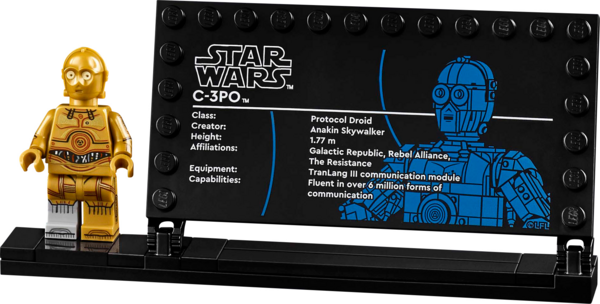 Воссоздайте каждую деталь любимого персонажа «Звездных войн», поверните его голову или подвигайте руками, чтобы создать знакомые позы. В этом наборе LEGO Star Wars также есть подставка с информационной табличкой C-3PO и местом для входящей в комплект минифигурки C-3PO, а также кирпичик LEGO Star Wars, посвященный 25-летию.