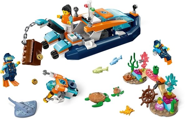 Создайте сцену для захватывающих приключений с дайвингом с помощью этого набора LEGO City Explorer Diving Boat, включающего 3 минифигурки исследователей.