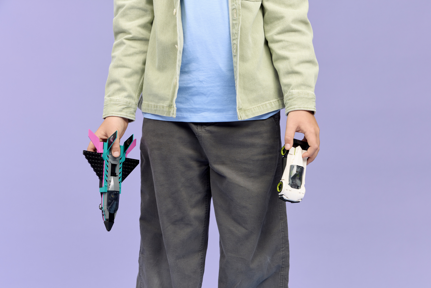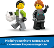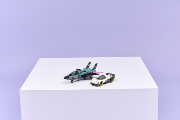 Набор LEGO City "Реактивный самолет против автомобиля" сочетает сразу два транспортных средства - стильный суперкар и сверхзвуковой реактивный самолет - для захватывающих гонок, полных воображения. Игрушечный реактивный самолет имеет крылья, отклоняющиеся назад, двойной вертикальный хвост и стабилизаторы. Дети могут передвинуть рычаг, чтобы включить форсажные двигатели самолета, а также открыть кабину суперкара с детализированным салоном и гоночным сиденьем. Добавьте минифигурки пилота и водителя, чтобы наслаждаться часами эпических гонок.