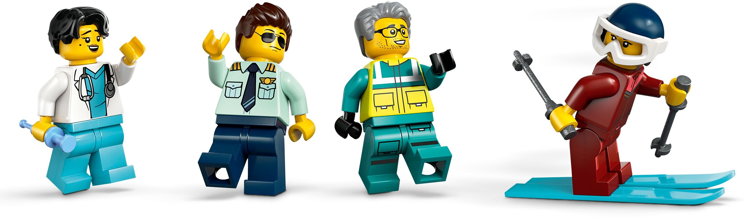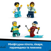 Что в наборе - Содержит все, что нужно детям для создания игрушечного самолета скорой помощи, снежного скутера и маленькой сцены в аэропорту с игрушечным ветровказом, а также минифигурки пилота, врача, парамедика и лыжника.