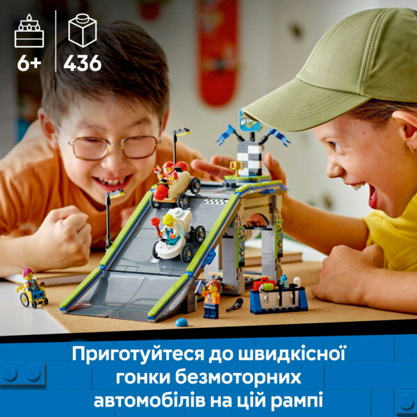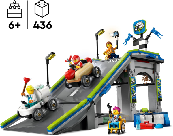Сделайте игру вашего ребенка еще более увлекательной благодаря набору для гонок безмоторного транспорта LEGO City Никаких ограничений: Автодром для гоночных автомобилей.