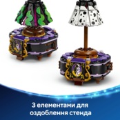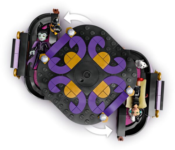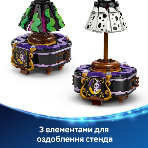 В нем представлены культовые платья диснеевских злодеек, 2 подставки для платьев и стенд с потайным местом для миникукол LEGO ǀ Disney, их питомцев и аксессуаров. В крутом игрушечном строительном наборе есть элементы для создания 3 различных дизайнов на подставке, а также профильные плитки Малефисенты и Круэллы Де Виль.