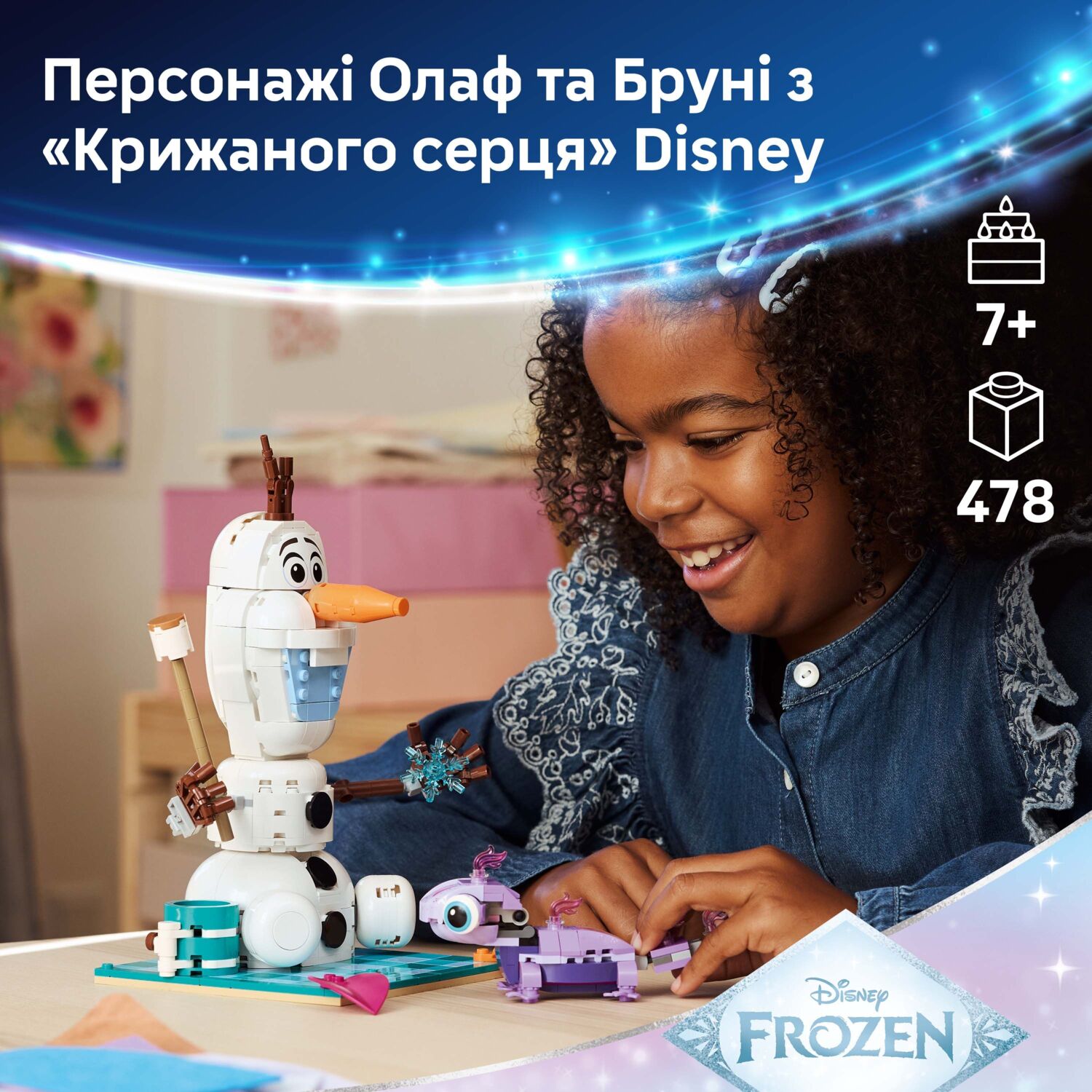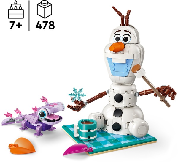 В наборе — 2 персонажа LEGO Disney (Олаф и Бруни), яркое одеяло для пикника, на котором можно сидеть, и другие аксессуары. После игры одеяло, снеговика и саламандру можно выставить как декор из фильма "Ледяное сердце" в ожидании будущих приключений.