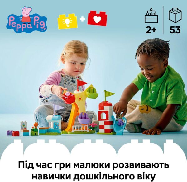 Игрушка для детей LEGO DUPLO Peppa Pig Ярмарка развлечений позволяет дошкольникам учиться через игру, развлекаясь в парке аттракционов с героями любимого мультсериала.